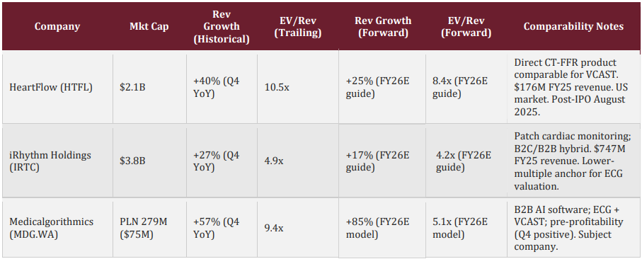 The most directly comparable public company is HeartFlow (HTFL), which IPO’d on the NYSE in August 2025 and trades at a $2.1B market capitalization on $176M FY2025 revenue with approximately 30% market share.