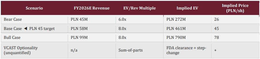 At the current share price of PLN 28.00, MDG is trading at approximately 5.1x our FY2026E revenue estimate, a modest premium to iRhythm at 4.2x forward, despite MDG growing at +85% forward versus iRhythm’s +17%, operating a pure B2B AI software model with near-zero marginal cost per additional session, and carrying an optionality asset in VCAST that iRhythm does not.