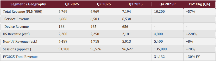 The anchor IDTF exceeded USD 300k/month in November and USD 400–450k in December alone. DRAI processed 420,000+ sessions in FY2025 (+56% YoY). Q4 2025 marked the company’s first EBITDA-positive quarter (PLN +1.0M on PLN 10.2M revenue). The Q4 2025 EBITDA inflection is evidence that this model works at scale.